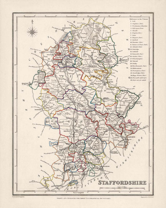 Este mapa meticulosamente elaborado por Samuel Lewis en 1844 presenta una gran cantidad de información sobre el condado de Staffordshire, Inglaterra. Sus intrincados detalles y su elegante diseño lo convierten en una adición cautivadora a cualquier colección. El mapa muestra los límites históricos de Staffordshire y destaca los cinco pueblos y ciudades principales y otras características notables de la época.