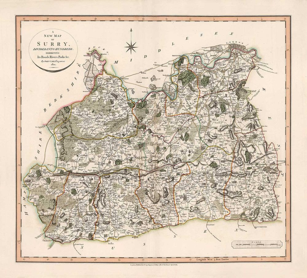 Este maravilloso mapa antiguo de Surrey fue publicado originalmente en 1801. Fue creado por John Cary.