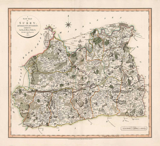 Como se puede ver, cuando se publicó este mapa, Surrey aún formaba parte de los condados de Londres, con el Támesis al norte del mapa, y no fue hasta hace relativamente poco, alrededor de 1965, cuando los distritos de Londres ocuparon una mayor parte de Surrey.