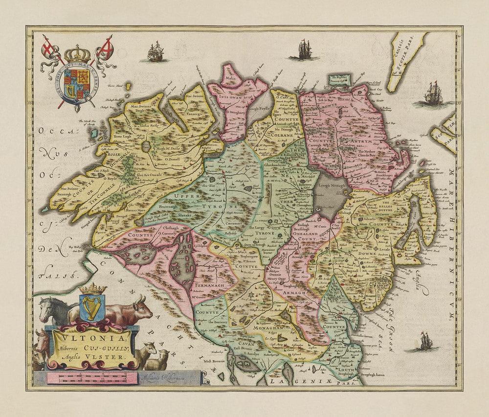 Viejo Mapa de Ulster, Irlanda del Norte en 1665 por Joan Blaeu: Belfast, Derry, Condado Antriment & Down, Eire
