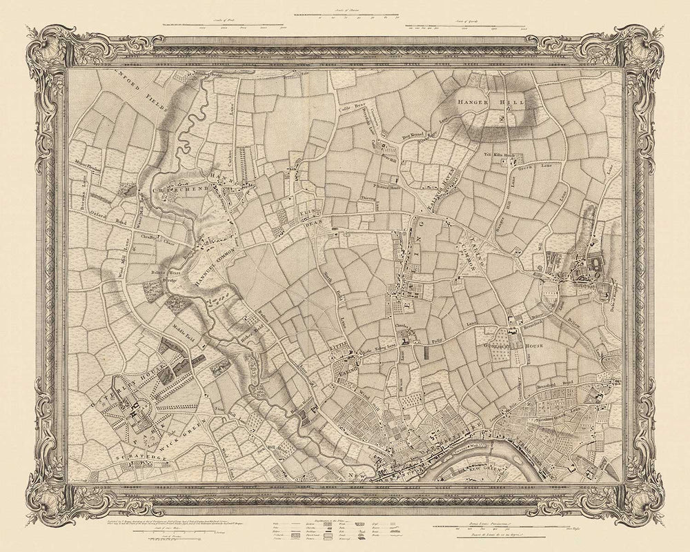 En la parte inferior izquierda del mapa, puedes ver Osterley House y Park, una mansión que fue construida a finales del siglo XVI, aunque fue remodelada poco después de que se publicara este mapa por Robert Adams y hoy es cuidada por el National Trust.