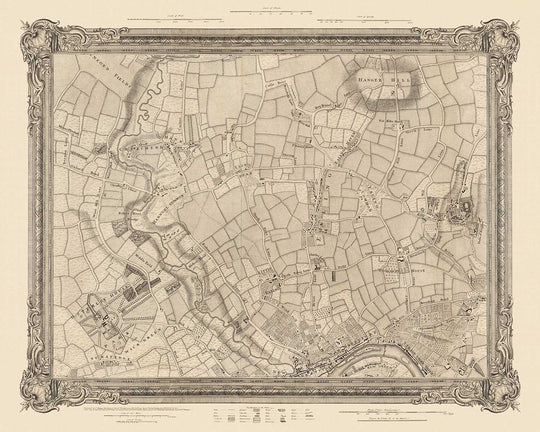 Publicado hace casi 300 años por el maestro cartógrafo John Rocque, este es el primer mapa detallado de West London. Fue publicado originalmente en 1746, tras un levantamiento altamente preciso de Londres y sus suburbios que comenzó en 1740. Es un hermoso, altamente detallado y extremadamente raro mapa antiguo.