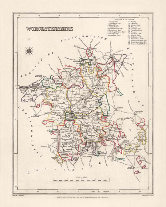 Mapa antiguo de Worcestershire por Samuel Lewis, 1844: Worcester, Kidderminster, Malvern, Evesham, Broadway