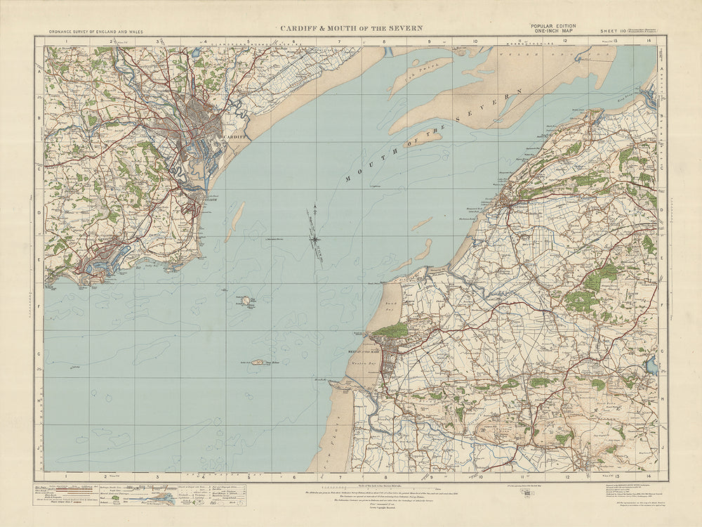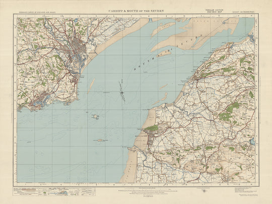 Este antiguo mapa de Ordnance Survey, Hoja 110 - Cardiff y desembocadura del Severn, publicado en 1925, ofrece una visión fascinante del pasado y muestra los pueblos, ciudades y características naturales de la región. El mapa cubre un área que incluye Cardiff, la capital de Gales, y la desembocadura del Severn, ofreciendo una perspectiva única del paisaje y los asentamientos de la época.