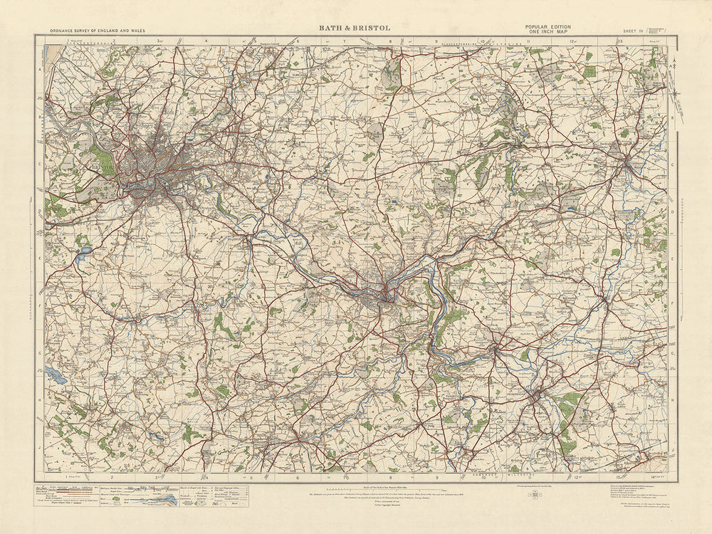 Este antiguo mapa de Ordnance Survey, Hoja 111 - Bath & Bristol, se publicó en 1925 como parte de la edición "Popular" de una pulgada para Inglaterra y Gales. El mapa muestra el condado histórico de Somerset, donde se encuentran las ciudades notables de Bath y Bristol. Además de estas ciudades destacadas, el mapa también incluye las ciudades de Chippenham, Trowbridge, Corsham, Melksham y la pintoresca zona de excepcional belleza natural de los Cotswolds (AONB).