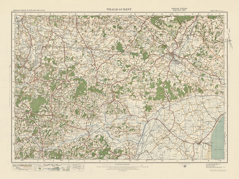 Nota: El título del producto incluye el nombre del mapa, "Hoja 126 - Weald of Kent, 1925" y los nombres de cinco ciudades o ubicaciones representadas en el mapa: Ashford, New Romney, Tenterden, Cranbrook y High Weald AONB.
