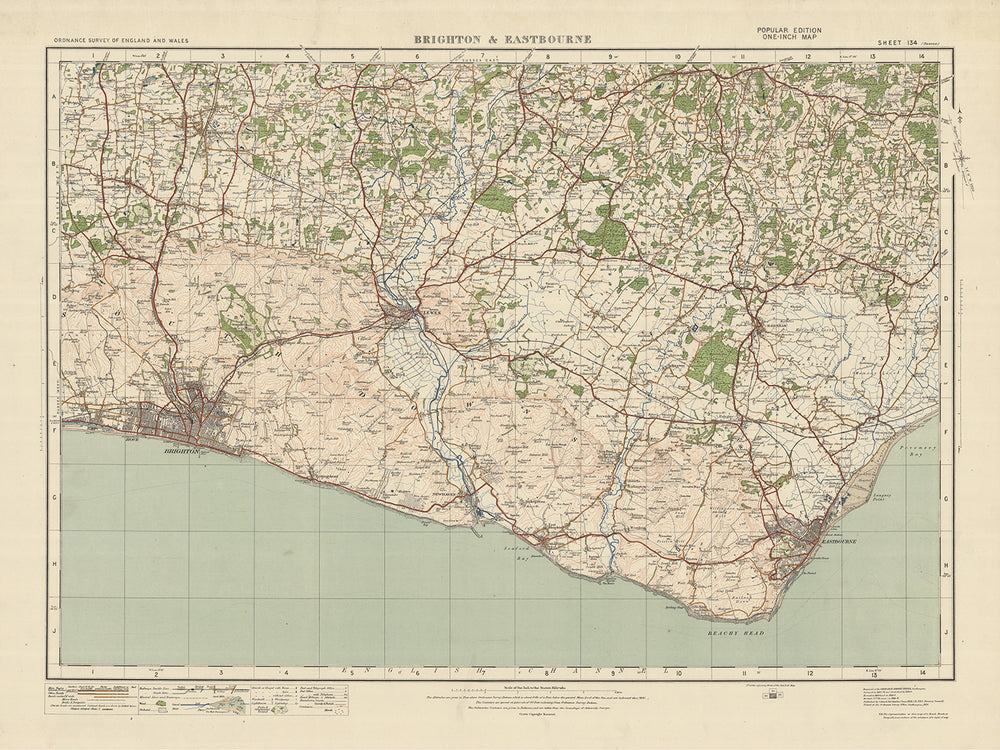 Este antiguo mapa, titulado "Hoja 134 - Brighton y Eastbourne", es parte de la edición "Popular" de una pulgada de Inglaterra y Gales del Ordnance Survey, publicada en 1925. El mapa muestra las ciudades de Brighton y Eastbourne, junto con varias otros asentamientos y características notables en el área circundante.