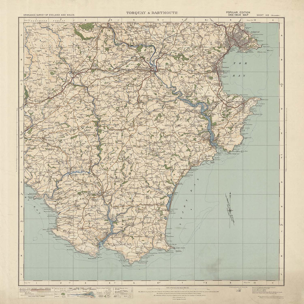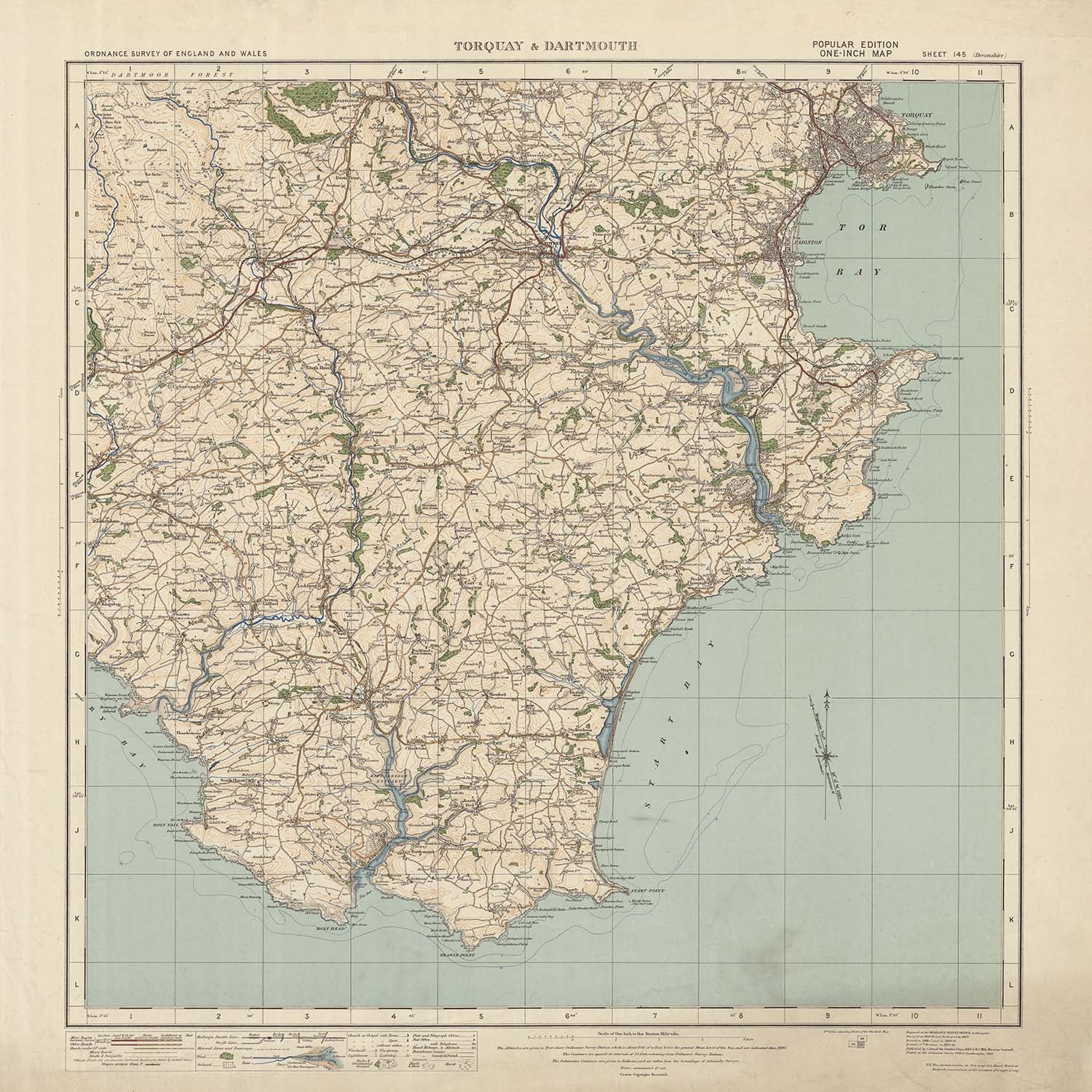 Mapa antiguo del Ordnance Survey, hoja 145: Torquay y Dartmouth, 1919-1926: Paignton, Totnes, Brixham, Parque Nacional de Dartmoor, Río Dart y Start Bay