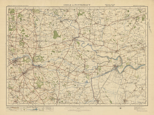 Este mapa antiguo de Ordnance Survey, hoja 32 - Goole y Pontefract, publicado en 1925, ofrece una visión fascinante del paisaje histórico de Inglaterra y Gales. Abarcando un área que incluye las ciudades de Goole y Pontefract, así como Castleford, Knottingley, Selby, Howden y Snaith, este mapa proporciona una gran cantidad de información para los entusiastas de la historia, cartógrafos y aquellos con un gran interés en el pasado de la región.