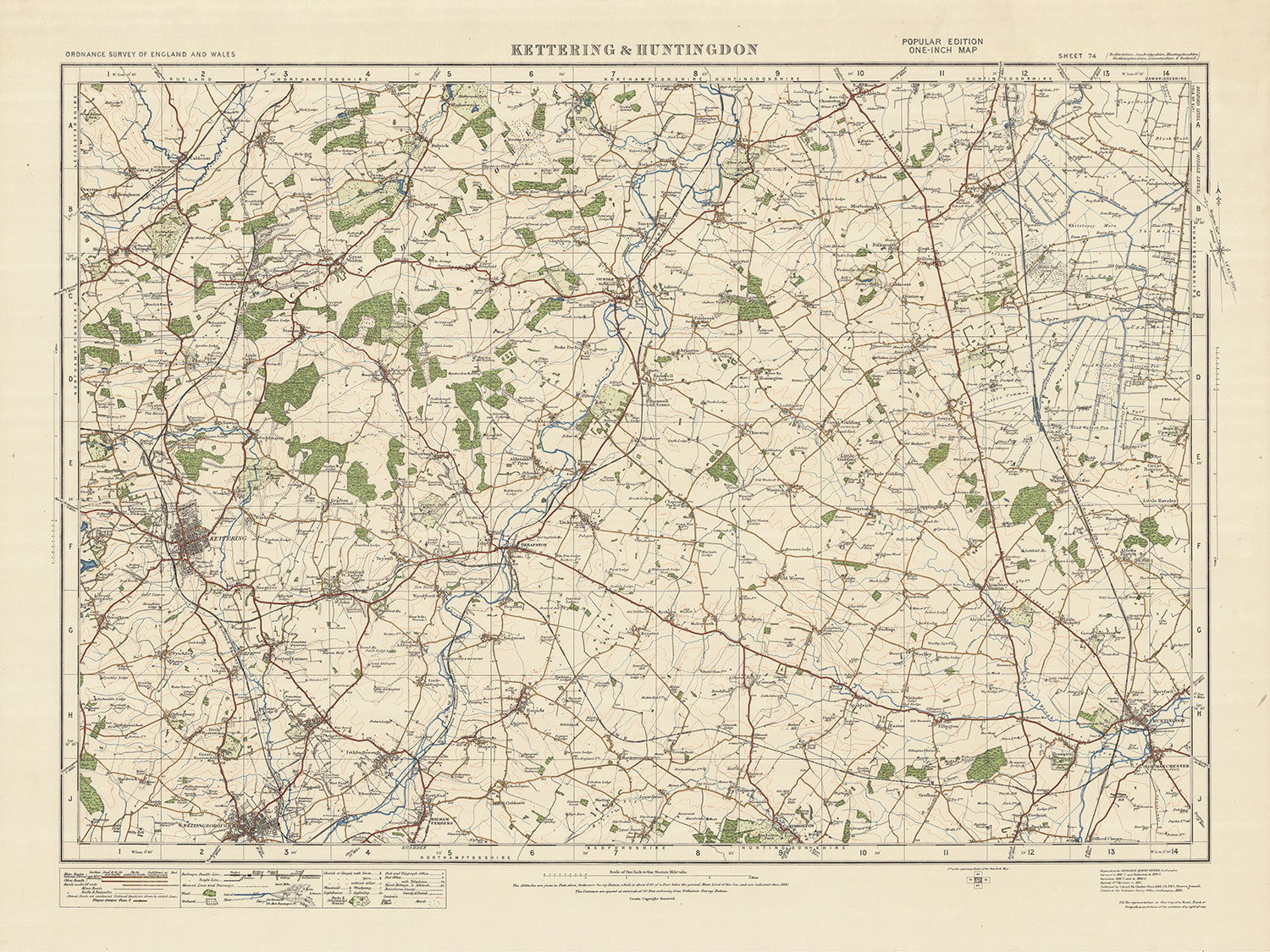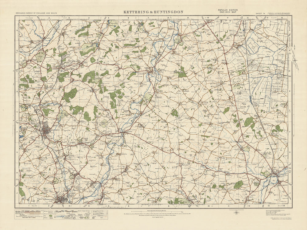 Explore el pasado con este mapa de Old Ordnance Survey, hoja 74 - Kettering & Huntingdon, 1925, y sumérjase en la historia, la geografía y el paisaje en evolución de esta cautivadora región de Inglaterra y Gales.