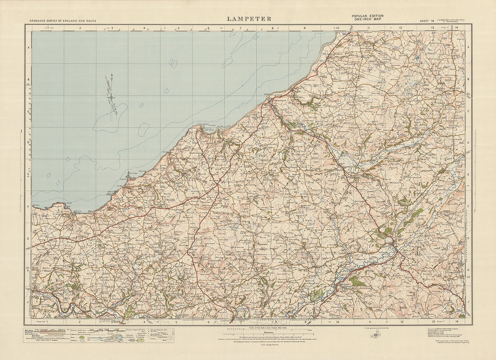 Este antiguo mapa de Ordnance Survey, Hoja 78 - Lampeter, de la edición "Popular" de una pulgada, Inglaterra y Gales, publicada en 1925, ofrece una visión fascinante del pasado. El mapa muestra el histórico condado de Lampeter, situado en el corazón de Gales, y presenta varios pueblos, ciudades y puntos de interés interesantes.