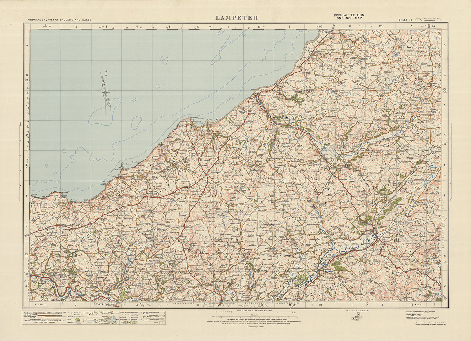 Mapa de Old Ordnance Survey, hoja 78: Lampeter, 1925: New Quay, Aberaeron, Llanbydder, Llandysul, Cardigan Bay