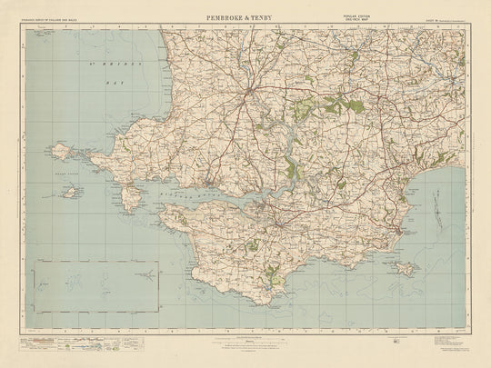 Esta reproducción meticulosamente elaborada del mapa de la edición "Popular" de una pulgada de Ordnance Survey, Hoja 99 - Pembroke & Tenby, publicado en 1925, ofrece una visión cautivadora del pasado. El mapa muestra el condado histórico de Pembroke & Tenby, ubicado en Gales, Reino Unido. Con una gran cantidad de pueblos, ciudades y lugares fascinantes, este mapa es una pieza notable de la historia cartográfica que agregará un toque de nostalgia e intriga a cualquier pared.