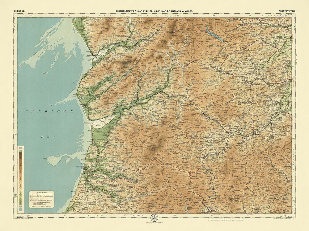 El diseño del mapa es tanto funcional como artístico, con una orientación paisajística que mejora su legibilidad e impacto visual. La sutil gradación de bandas de color para mostrar la tierra a diferentes alturas es un testimonio de la habilidad y atención al detalle de Bartholomew. Esta técnica permite una comprensión matizada del terreno, destacando características como el Plynlimon, el punto más alto de las Montañas Cámbricas, y los exuberantes valles esculpidos por los ríos de la región. El mapa también marca hitos históricos significativos, incluyendo las ruinas de la Abadía de Strata Florida y el icónico Puente del Diablo, añadiendo capas de contexto cultural e histórico a la información geográfica.