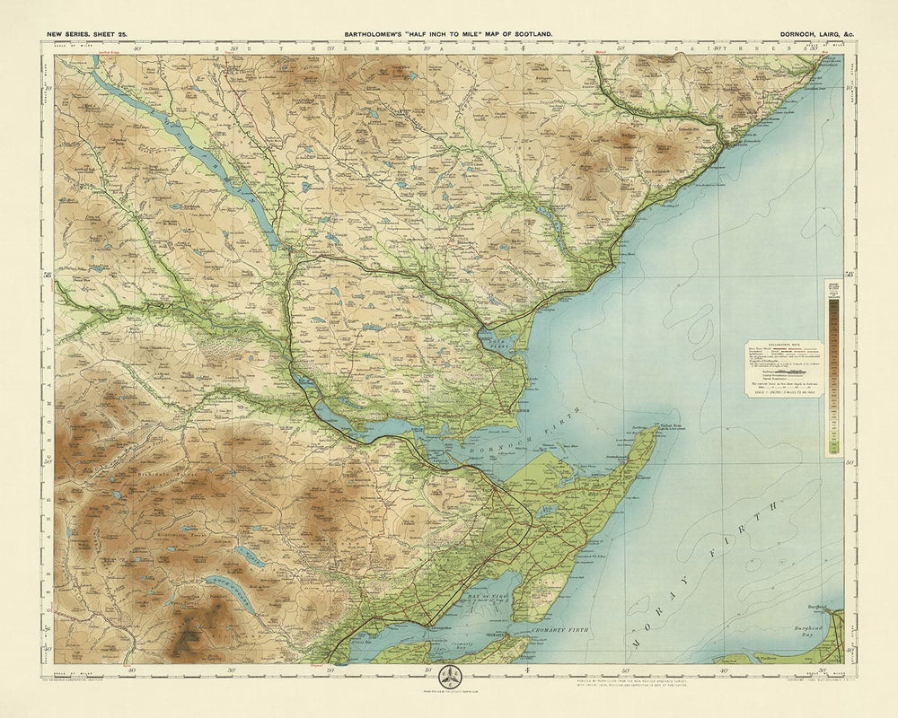 La hoja 25 - Dornoch, Lairg, elaborada por el estimado J.G. Bartholomew en 1901, es un testimonio de la edad dorada de la cartografía. Bartholomew, a menudo aclamado como "el Príncipe de los Cartógrafos", aportó un nivel de detalle y arte sin igual a sus mapas, haciéndolos tanto funcionales como visualmente cautivadores. Este mapa, parte de la serie insignia de Bartholomew de media pulgada por milla, fue diseñado pensando en ciclistas y turistas, capturando la esencia de Escocia a principios del siglo XX. Sus intrincadas capas de color no solo destacan las matices topográficas, sino que también ofrecen una vívida representación de la belleza natural de la región.