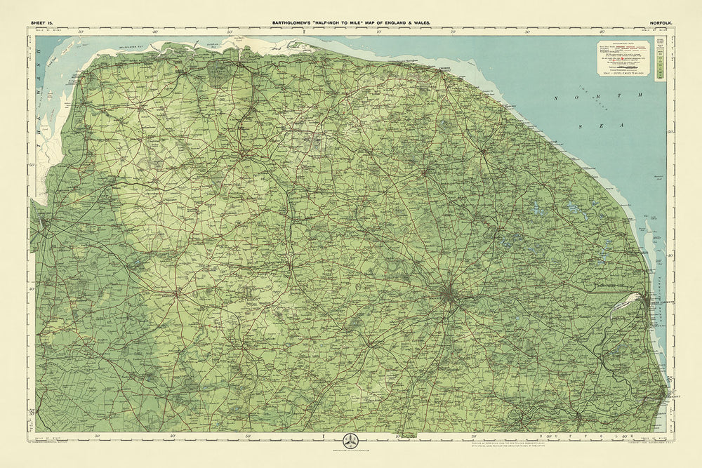 La "Hoja 15 - Norfolk" de Bartholomew es más que un mapa; es un documento histórico que encapsula la esencia de Norfolk en un momento crucial de su historia. La claridad, precisión y atractivo estético del mapa lo convierten en una pieza atesorada para coleccionistas y entusiastas de la historia por igual. Ya sea que te atraiga su belleza cartográfica, su significado histórico o su detallada representación de los paisajes y monumentos de Norfolk, este mapa es un testimonio atemporal del legado perdurable de Bartholomew en el mundo de la cartografía.