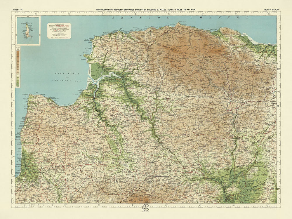 El diseño y estilo del mapa reflejan la dedicación de Bartholomew a crear mapas que sean tanto funcionales como estéticamente agradables. El uso de diferentes capas de color para representar el relieve del paisaje fue una técnica pionera que distinguió sus mapas. Este enfoque innovador, combinado con la representación detallada de características políticas y físicas, convierte la hoja 35 - North Devon en un ejemplo notable de la cartografía de principios del siglo XX. Es un testimonio de la habilidad y visión de Bartholomew, ofreciendo un fascinante vistazo al pasado para coleccionistas y entusiastas de la historia de hoy.