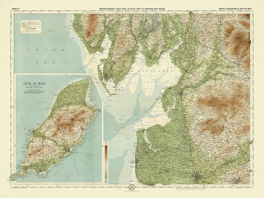 Adéntrate en el pasado con la exquisita "Hoja 5 - Norte de Lancashire y la Isla de Man," una creación magistral del estimado cartógrafo J.G. Bartholomew en 1901. Conocido como "el Príncipe de los Cartógrafos," el trabajo de Bartholomew es celebrado por su meticuloso detalle y diseño innovador. Este mapa, parte de la serie insignia de Bartholomew, fue elaborado a una escala de media pulgada por milla, convirtiéndolo en una posesión preciada para ciclistas y turistas de principios del siglo XX. El mapa ofrece una fascinante visión de la geografía histórica del Norte de Lancashire y la Isla de Man, regiones ricas tanto en belleza natural como en significado histórico.