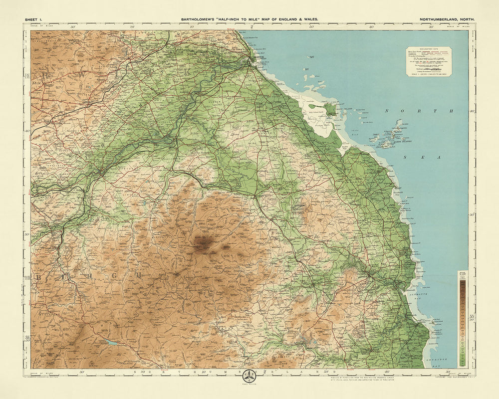 El mapa también proporciona una vista detallada de la infraestructura de la región, mostrando ciudades y pueblos como Alnwick, Berwick-upon-Tweed, Morpeth y Hexham. Estos asentamientos, cada uno con su historia y encanto únicos, están intrincadamente mapeados, reflejando la vibrante geografía humana del área. La cuidadosa representación de carreteras y ferrocarriles ilustra la conectividad y accesibilidad de Northumberland a principios del siglo XX, haciendo de este mapa un recurso invaluable para entender el contexto histórico y geográfico de esta fascinante región.