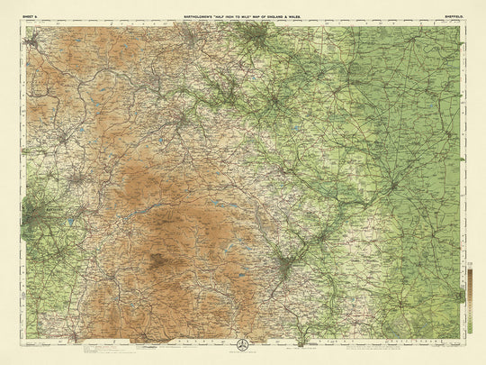 La Hoja 9 - Sheffield, creada por el estimado cartógrafo J.G. Bartholomew en 1901, es una representación magistral de las regiones central y norte de Inglaterra. Este mapa, parte de la renombrada serie de Bartholomew de Media Pulgada por Milla, captura los intrincados detalles del paisaje con una precisión notable. Bartholomew, un cartógrafo escocés celebrado por sus mapas detallados y estéticamente agradables, diseñó este mapa pensando tanto en turistas como en ciclistas, convirtiéndolo no solo en una herramienta de navegación, sino también en una obra de arte. El uso innovador del color para representar la elevación proporciona una comprensión vívida e intuitiva del terreno, diferenciándolo de otros mapas de su época.
