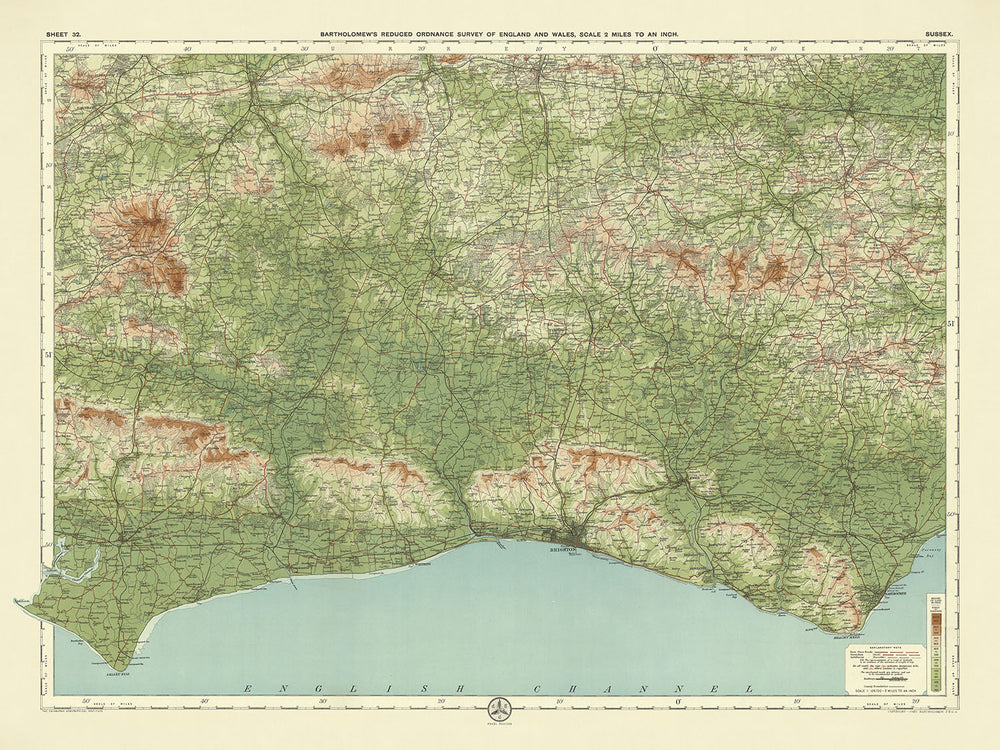 El diseño de este mapa es particularmente notable por su uso innovador del color para representar el relieve del paisaje. Diferentes capas de bandas de color gradúan sutilmente para mostrar la tierra a diversas alturas, proporcionando una representación vívida e informativa del terreno. Los South Downs, con sus ondulantes colinas de tiza, están prominentemente destacados, junto con otros hitos naturales como los icónicos acantilados de tiza de Beachy Head y la exuberante extensión del Bosque de Ashdown. El atractivo estético del mapa se iguala con su diseño funcional, convirtiéndolo en una posesión preciada tanto para coleccionistas como para entusiastas de la historia.