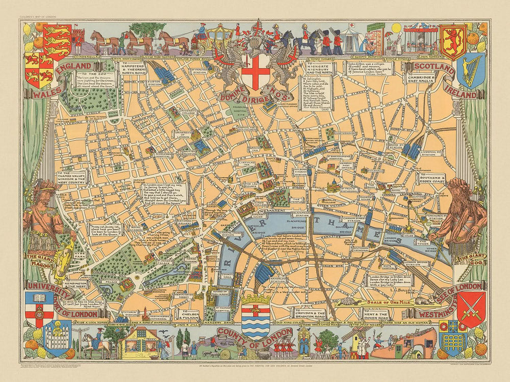 El "Mapa infantil de Londres", elaborado en 1938 por Leslie George Bullock y publicado por John Bartholomew & Son Ltd., ofrece una encantadora visión del vibrante corazón de Londres. Este extravagante mapa es una cautivadora combinación de historia y arte, diseñado para atraer y educar a las mentes jóvenes. Con sus coloridas ilustraciones y encantadoras representaciones de lugares emblemáticos, invita a los espectadores a explorar las bulliciosas calles y el rico patrimonio de una de las ciudades más fascinantes del mundo.