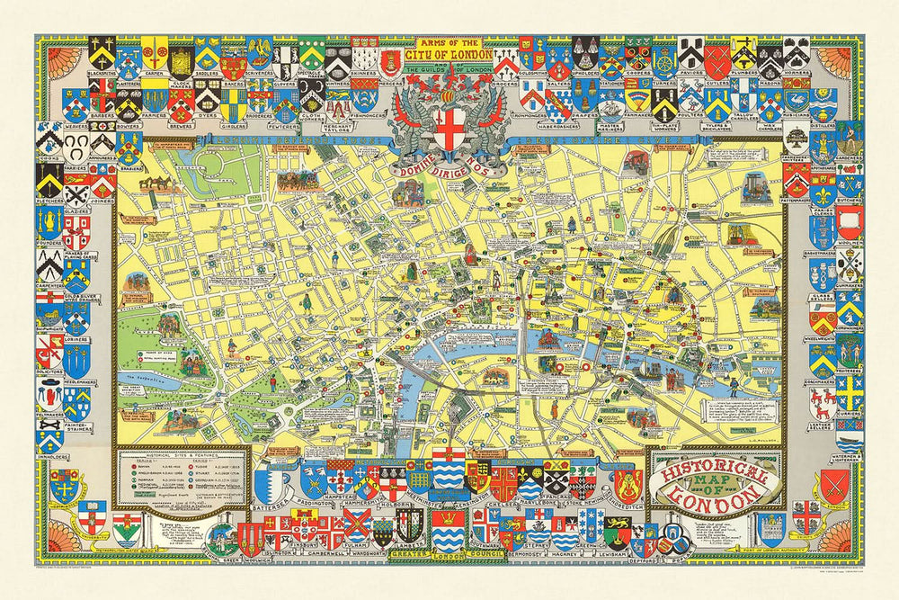 Antigua Mapa Pictórico de Londres por Bullock, 1965: Escudos de Armas, Monumentos, Westminster, Ciudad