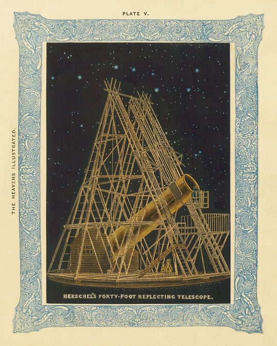 La imagen del telescopio de Herschel no solo es históricamente rica, sino también estéticamente impresionante. Los finos detalles y las técnicas de coloreado a mano ejemplificadas en este mapa representan la estructura y las complejidades del telescopio de una manera que las impresiones modernas rara vez capturan. La coloración sutil pero detallada ofrece un encanto vintage, fusionando la curiosidad científica con la expresión artística.