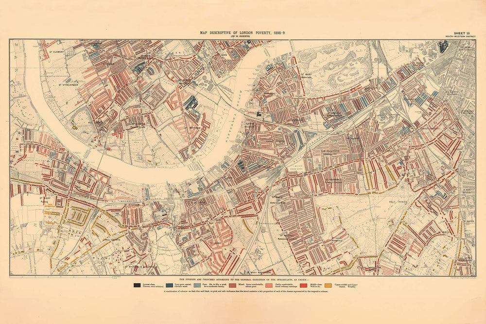 Esta es una impresión de la hoja 10 del Mapa de la Pobreza de Londres, creado por Charles Booth en 1898-9.