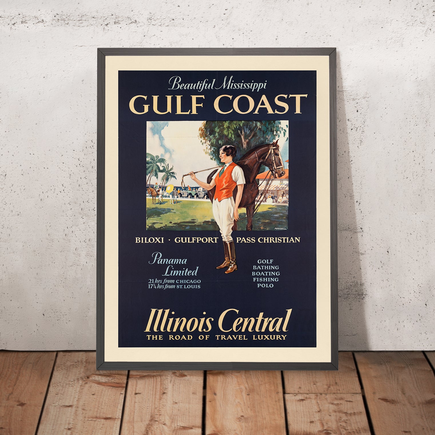 Beautiful Mississippi Gulf Coast by Paul Proehl invites you to the sunlit resort towns of Biloxi, Gulfport, and Pass Christian at the height of America’s rail‑age glamour. In the central vignette a polo player in crisp white jodhpurs and a scarlet vest rests his mallet across his shoulder beside a chestnut horse, while palms, striped awnings, sleek roadsters, and a sliver of turquoise sea set the scene. Commissioned for the Illinois Central Railroad, the poster is crowned with the elegant script “Beautiful Mississippi” over the monumental words “GULF COAST,” and promotes the line’s famed “Panama Limited,” noting “21 hrs. from CHICAGO” and “17 3/4 hrs. from ST. LOUIS.”