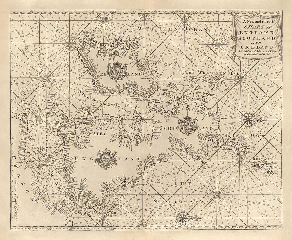 Esta maravillosa antigua mapa de un gráfico de navegación marítima de las Islas Británicas fue publicado originalmente en 1752. Fue creado por Page & Mount.