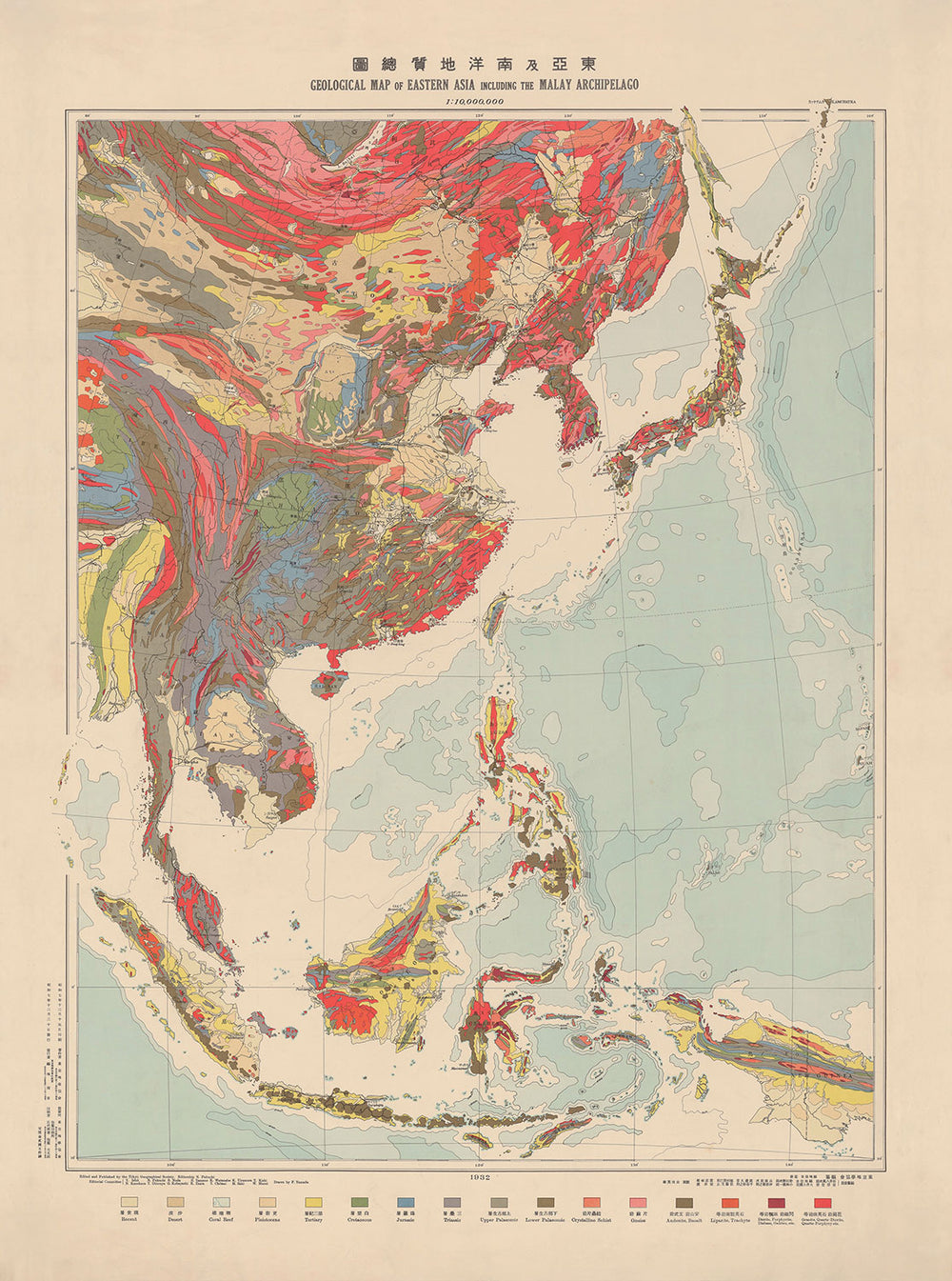 Esta maravillosa antigua mapa de la Geología de Asia Oriental fue publicada originalmente en 1932. Fue creada por la Sociedad de Geología de Tokio.