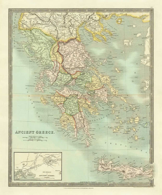 El mapa muestra a la antigua Grecia, incluida Macedonia al norte, ya que fue en aproximadamente los siglos XII a 9ºC. Un encantador mapa de inserción en la esquina inferior izquierda muestra un primer plano de los restos modernos de la antigua Atenas.