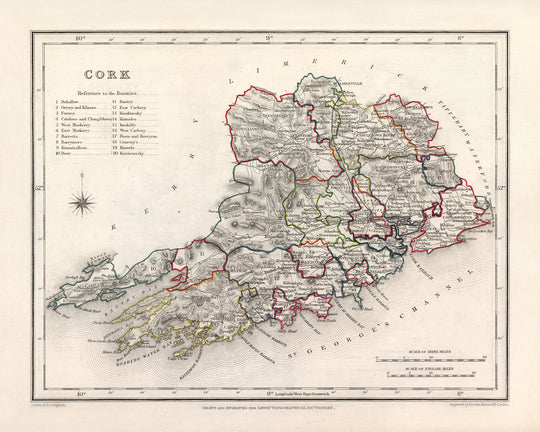 Poseer este antiguo mapa de Cork de Samuel Lewis, creado en 1844, le permitirá sumergirse en el tapiz histórico del condado de Cork y apreciar su cautivadora belleza.