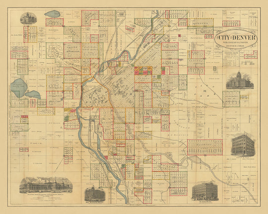 El mapa está adornado además con seis viñetas ilustradas, cada una de las cuales representa un hito importante de la época. Estos incluyen el Edificio de Exposiciones Industriales y Mineras Nacionales, que se inauguró el 1 de agosto de 1882, el Hotel Windsor, el Hotel St. James, el Edificio Daniels & Fisher, el Palacio de Justicia y la Casa de la Escuela. Estas ilustraciones no sólo realzan el atractivo estético del mapa sino que también brindan una narrativa visual del patrimonio arquitectónico de Denver. Cada viñeta sirve como una ventana al pasado, ofreciendo una visión de las estructuras prominentes de la ciudad y sus roles en la comunidad.