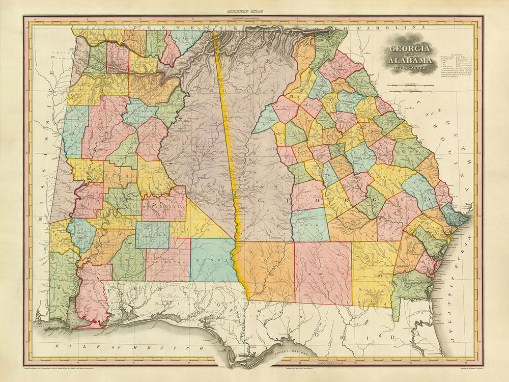 Antigua mapa de Georgia y Alabama por H. S. Tanner, 1820: Atlanta, Savannah, Augusta, Columbus (GA) y Montgomery