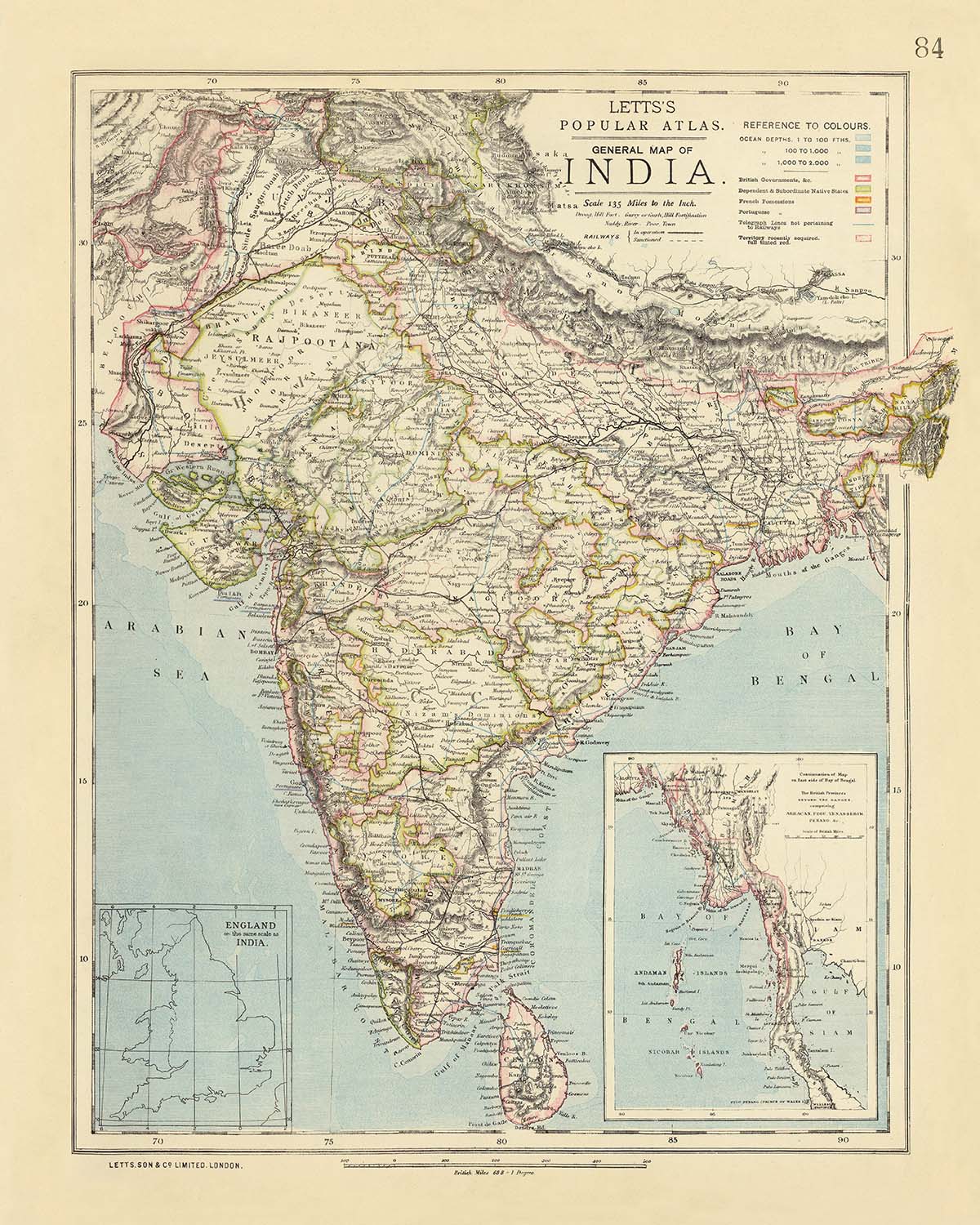 Antigua mapa de India por Letts, 1883: Calcuta, Bombay, Madrás, mar Arábigo, bahía de Bengala