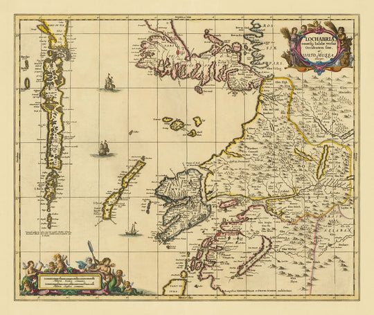 Esta encantadora y detallada mapa a mano, extremadamente rara de Mull, Skye, Lochaber y las Hébridas Exteriores fue publicada originalmente en 1690 por Valk & Schenk, un dúo maestro de cartografía que trabajó en Ámsterdam en el siglo XVII.