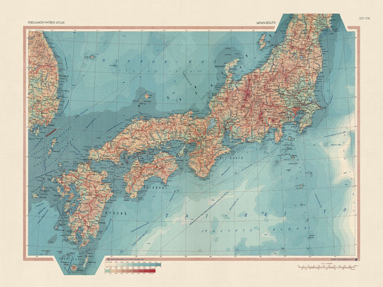 Mapa antiguo de Japón, 1967: Mapa físico y político de Honshu, Shikoku y Kyushu