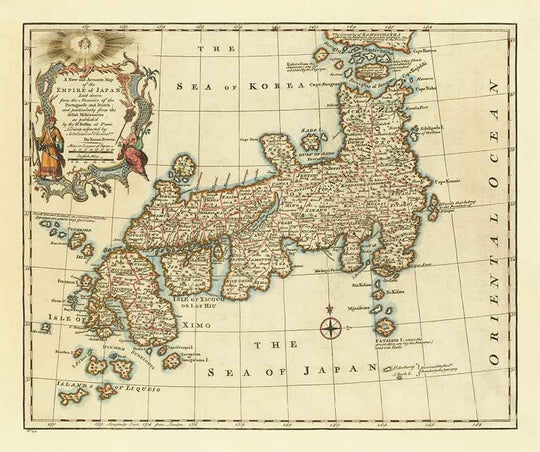 Probablemente el mejor mapa de Japón del siglo XVIII, puedes ver que la comprensión del Oeste sobre la geografía japonesa todavía era bastante limitada. Honshu, Kyushu y Shikoku están aquí, pero Hokkaido está completamente ausente. En su lugar, Kamchatka (parte de Rusia) está en la esquina superior derecha del mapa - sí, esa Kamchatka de Stranger Things.