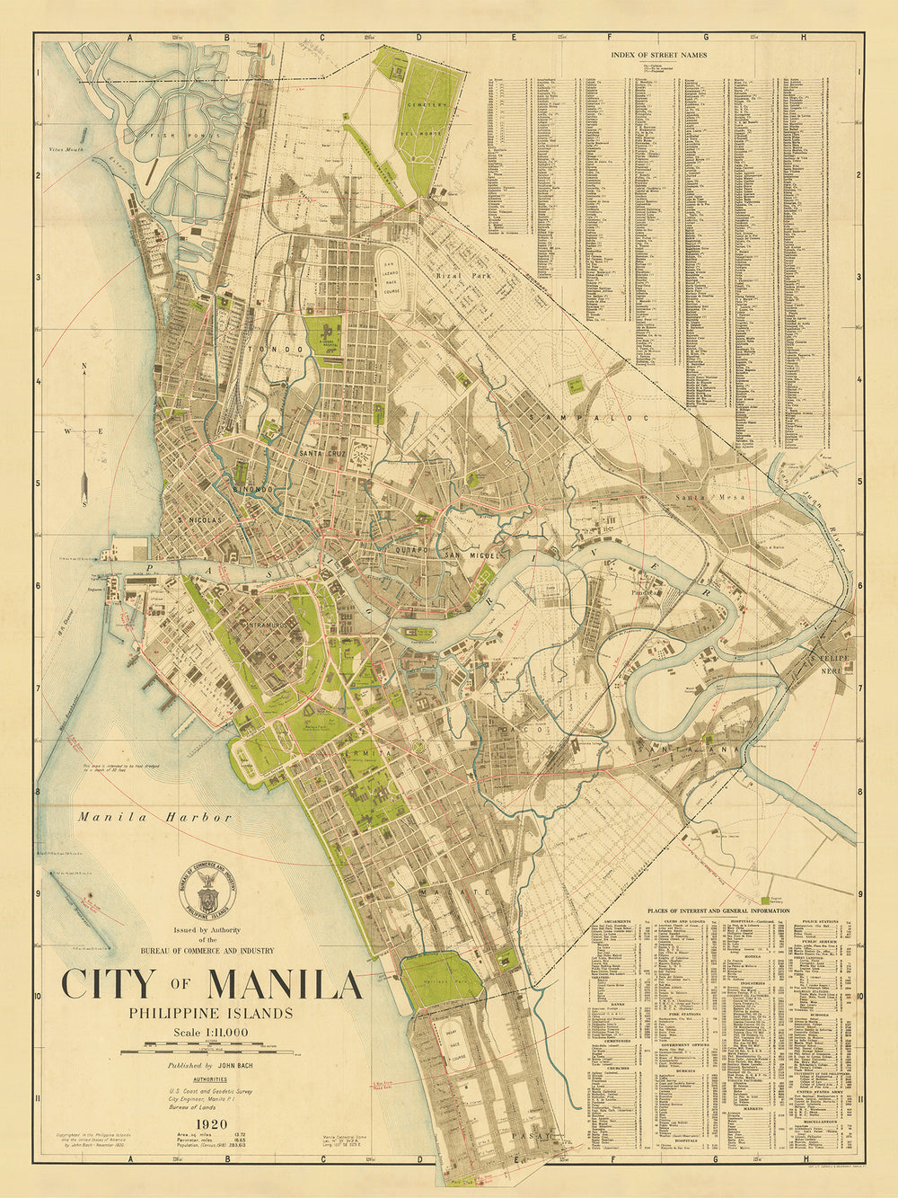 Este mapa antiguo de Manila, Filipinas, de John Bach de 1920, es una ventana fascinante al pasado de la ciudad. El mapa muestra la ciudad con gran detalle, con sus calles, edificios y vías fluviales claramente etiquetados. También incluye una serie de puntos de referencia importantes, como:
