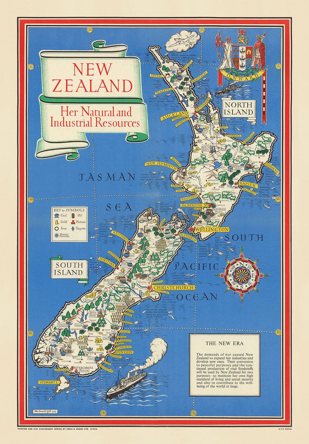 El mapa se centra en los recursos industriales y naturales de las Islas Norte y Sur de Nueva Zelanda, mostrando cómo el país ha tenido que 'expandir sus industrias y desarrollar nuevas' para ayudar con la guerra. El mapa también muestra cómo Nueva Zelanda continúa 'produciendo alimentos vitales... para mantener su propio alto nivel de vida y seguridad social, y también para contribuir al bienestar del mundo en general.'