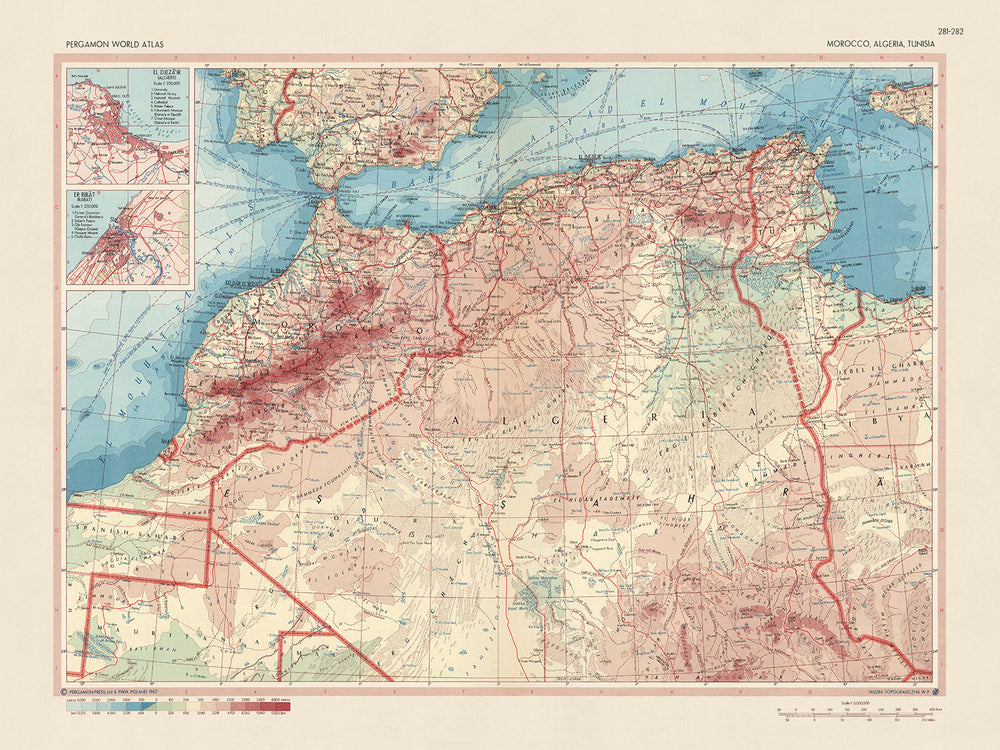 El exquisito mapa 'Marruecos, Argelia, Túnez' es un magnífico testimonio de la experiencia del Servicio de Topografía del Ejército Polaco, reconocido por su precisión y atención al detalle. Publicado en 1967, este mapa captura los intrincados paisajes políticos y físicos del noroeste de África con un extraordinario nivel de detalle. Cada ciudad, pueblo y punto de referencia está meticulosamente representado, lo que demuestra el compromiso del cartógrafo con la precisión y la profundidad de comprensión. Los recuadros de El Djezair (Argel) y Er Ribat (Rabat) ofrecen una vista más centrada de estas importantes ciudades, proporcionando una exploración íntima de sus geografías únicas.