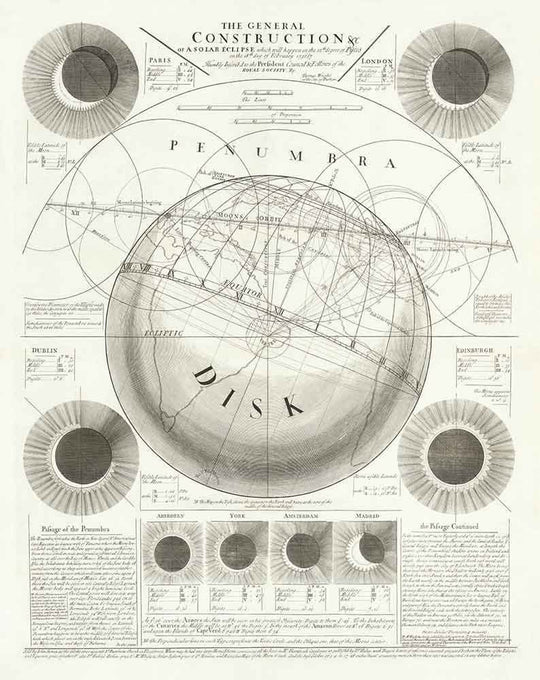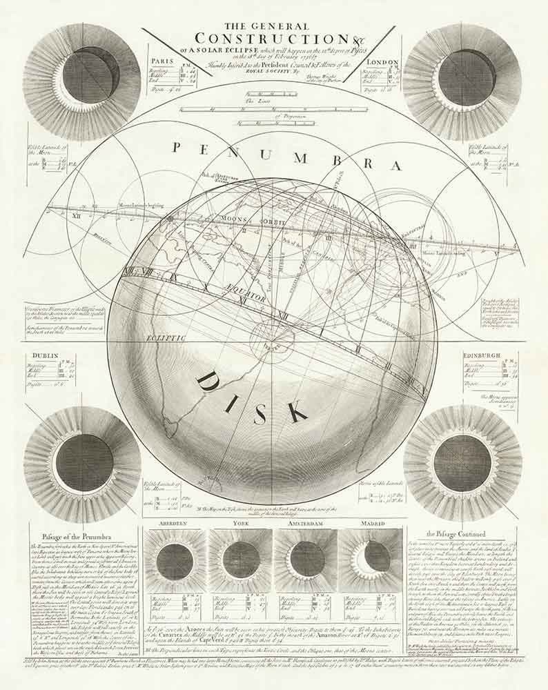 Un gráfico fascinante y raro que ilustra el camino del eclipse solar del 18 de febrero de 1737. El gráfico fue creado por el astrónomo Thomas Wright y publicado por John Senex, uno de los editores más notables de materiales astronómicos en ese momento.