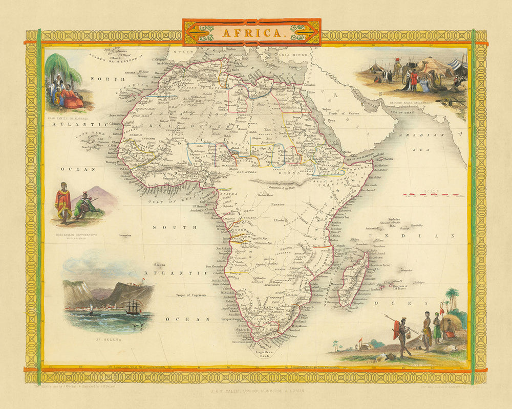 Antigua Mapa del Mundo de África por Tallis & Rapkin, 1851: Ilustraciones Decorativas de Árabes Beduinos, Santa Elena, Hotentotes