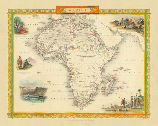 Este mapa de África de 1851 por Tallis & Rapkin es un mapa político y físico detallado del mundo. Es un excelente ejemplo del trabajo de Tallis, y es apreciado por sus maravillosos viñetas de escenas indígenas, personas, etc. El mapa cubre una área geográfica muy grande, incluyendo todo el continente africano. Es un mapa hermoso e informativo que sería una gran adición a cualquier colección.