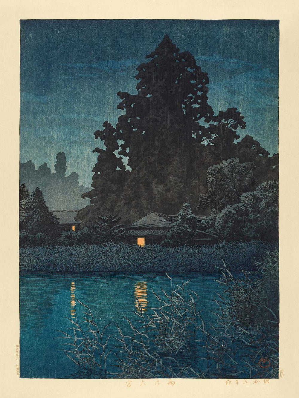 Kawase Hasui se erige como una figura clave en el movimiento shin-hanga japonés. Su notable contribución radica en sus paisajes poéticos que combinan influencias tradicionales y contemporáneas, reflejando la belleza tranquila de Japón. "Omiya en la lluvia" (japonés: 雨の大宮, Ame no Ōmiya) es significativa por su capacidad de evocar profundidad emocional y atmósfera, atrayendo a los espectadores hacia su tranquilidad introspectiva.