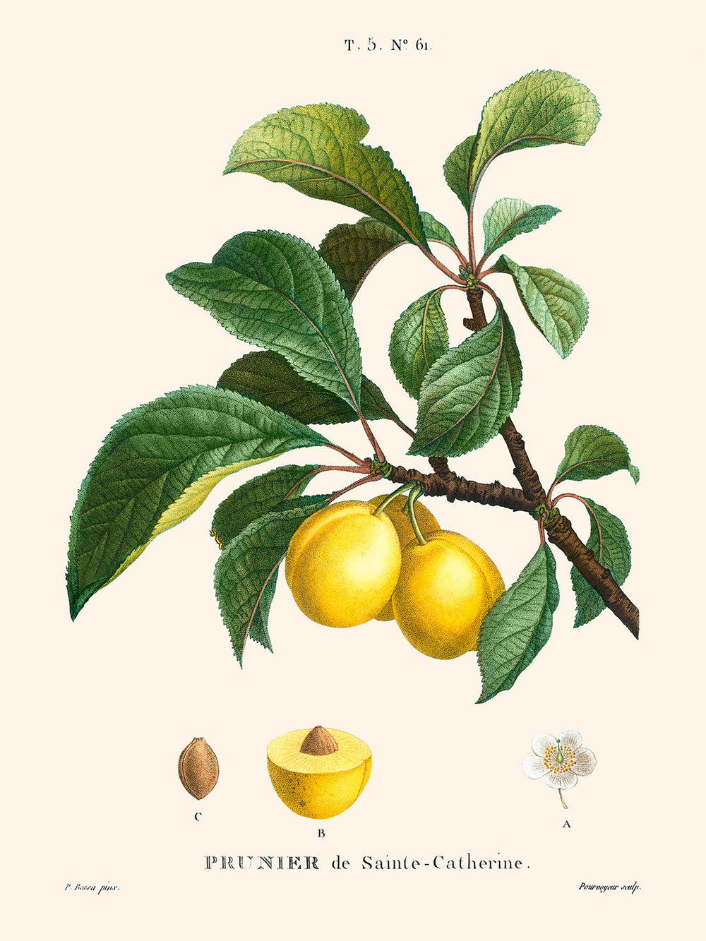La ciruela, publicada por primera vez en 1827, es una hermosa ilustración botánica de Pierre-Joseph Redouté. Conocido como el "Rafael de las flores", Redouté pasó gran parte de su vida pintando meticulosamente la flora en el Château de Malmaison a petición de Josefina Bonaparte, la esposa de Napoleón.