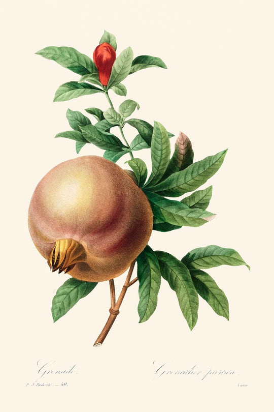 La "Granada" de Pierre-Joseph Redouté, publicada por primera vez en 1827, es un espléndido ejemplo de ilustración botánica victoriana. Esta exquisita obra de arte es un testimonio del extraordinario talento de Redouté, que se puso de relieve en su ilustre carrera al pintar la flora del castillo de Malmaison a petición de Josefina Bonaparte, consorte de Napoleón.