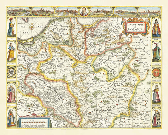 A lo largo del borde superior del mapa son hermosas, ilustraciones detalladas de seis ciudades-Cracovia, Danzig (Gdansk), Pozna ń, Krosno Odrza ń skie, Sandomierz y Wroc ł aw. En los bordes izquierdo y derecho están dibujos de lo que la gente en Polonia (Polonians) parecía en diferentes ciudades.